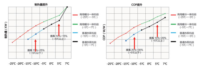 采用噴氣增焓壓縮機,擴寬運行范圍及能力。低溫下與普通熱泵機組相比,能力提升10%~15%,能效提升15%~20%。