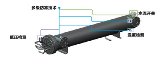 每個模塊都自帶水流開關(guān),單獨對各模塊進行1級防凍保護,此外還有2級溫度檢測、3級低壓檢測保護,防止因水流不均勻、環(huán)溫過低等問題引起殼管凍壞。
