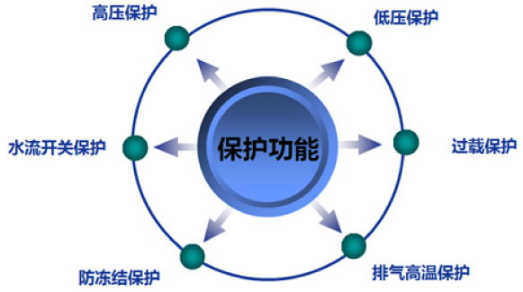 高壓保護(hù)、低壓保護(hù)、水流開(kāi)關(guān)保護(hù)、過(guò)載保護(hù)、防凍結(jié)保護(hù)、排氣高溫保護(hù)。