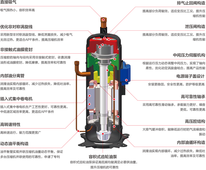大容量高壓腔渦旋壓縮機采用內(nèi)部油分離機構(gòu),通過內(nèi)部油霧分離器設(shè)計和內(nèi)部回油管設(shè)計,使壓縮機潤滑油大部分保存在壓縮機內(nèi),只有少量油被帶出壓縮機,有效防止因多余的冷凍油在制冷循環(huán)中造成的能力下降,效率進一步提高;采用防過壓縮技術(shù),有效的防止了冷凝壓力過高而造成的功耗增加問題,壓縮機運轉(zhuǎn)更節(jié)能,同時使得制冷系統(tǒng)更加穩(wěn)定可靠。