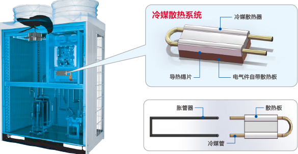 ◎冷媒散熱板采用高導(dǎo)熱性能的鋁 合金和內(nèi)部機械脹管加工方法,實 現(xiàn)銅管與散熱板之間的360°緊密 貼合,散熱性能更優(yōu)。