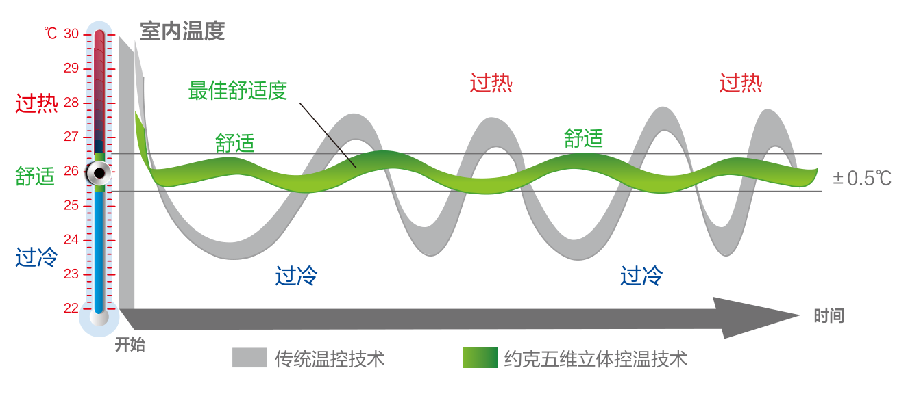 采用直流壓縮機(jī)結(jié)合無(wú)級(jí)變頻技術(shù),搭載特有“五維立體控溫系統(tǒng)”,根據(jù)出風(fēng)溫度傳感器、室內(nèi)機(jī)回風(fēng)口溫度傳感器、室內(nèi)機(jī)換熱器的兩個(gè)換熱盤管溫度傳感器、線控器傳感器,同步檢測(cè)室溫,實(shí)現(xiàn)±0.5℃溫度調(diào)節(jié),有效避免忽冷忽熱,溫度持久恒定舒適。