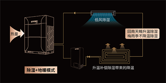 溫度低濕度高的濕冷季節(jié),單一除濕會導(dǎo)致室溫降低,體感陰冷。約克特有不降溫除濕功能,系統(tǒng)回收室內(nèi)機(jī)除濕時排放的廢熱,將其轉(zhuǎn)為地暖供熱,除濕同時室溫恒定,保持體感舒爽。