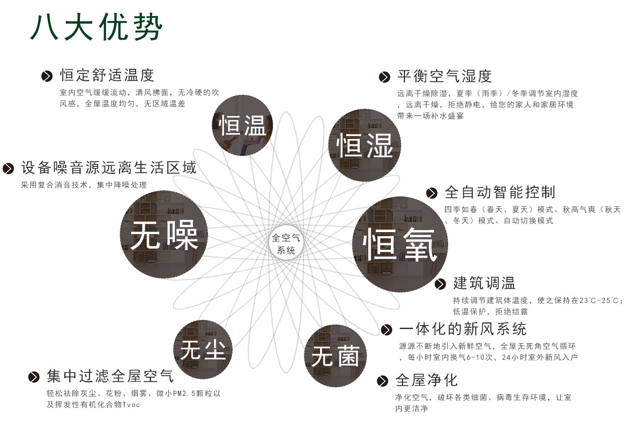 全空氣系統(tǒng)使用一套系統(tǒng)迭代室內(nèi)空調(diào)、采暖、新風、除濕、加濕、空氣凈化、空氣殺菌等多種設(shè)備組合;并以健康體感為標準,電腦精準調(diào)節(jié)全空氣控制邏輯