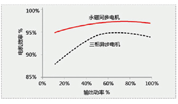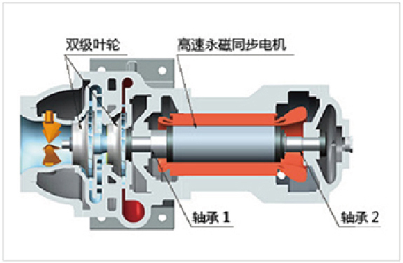 ·采用大功率高速永磁同步電機,功率達400KW以上,轉(zhuǎn)速達18000rpm以上。且其體積小,重量輕,400KW的高速永磁同步電機重量相當(dāng)于75KW的交流感應(yīng)電機。高速永磁同步變頻電機的啟動電流小,電機效率均達到96%以上,效率可高達98.2%,大大提高機組滿負(fù)荷于部分負(fù)荷的運行能效。