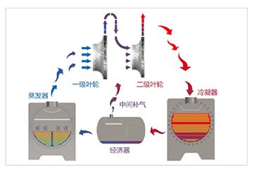 ·雙級壓縮補(bǔ)氣技術(shù),相比單級制冷循環(huán)效率提高了5~6%。同時采用雙級壓縮,葉輪出口的氣流角大,喘振裕度大,運(yùn)行范圍更廣。