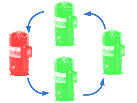 壓縮機(jī)均衡運(yùn)行,按每臺(tái)壓縮機(jī)的運(yùn)行時(shí)間,確定壓縮機(jī)啟動(dòng)或關(guān)閉的優(yōu)先權(quán),防止單臺(tái)壓縮機(jī)過(guò)度使用,有效的延長(zhǎng)壓縮機(jī)使用壽命;啟動(dòng)時(shí)壓縮機(jī)逐臺(tái)啟動(dòng),啟動(dòng)電流小,對(duì)電網(wǎng)沖擊小。